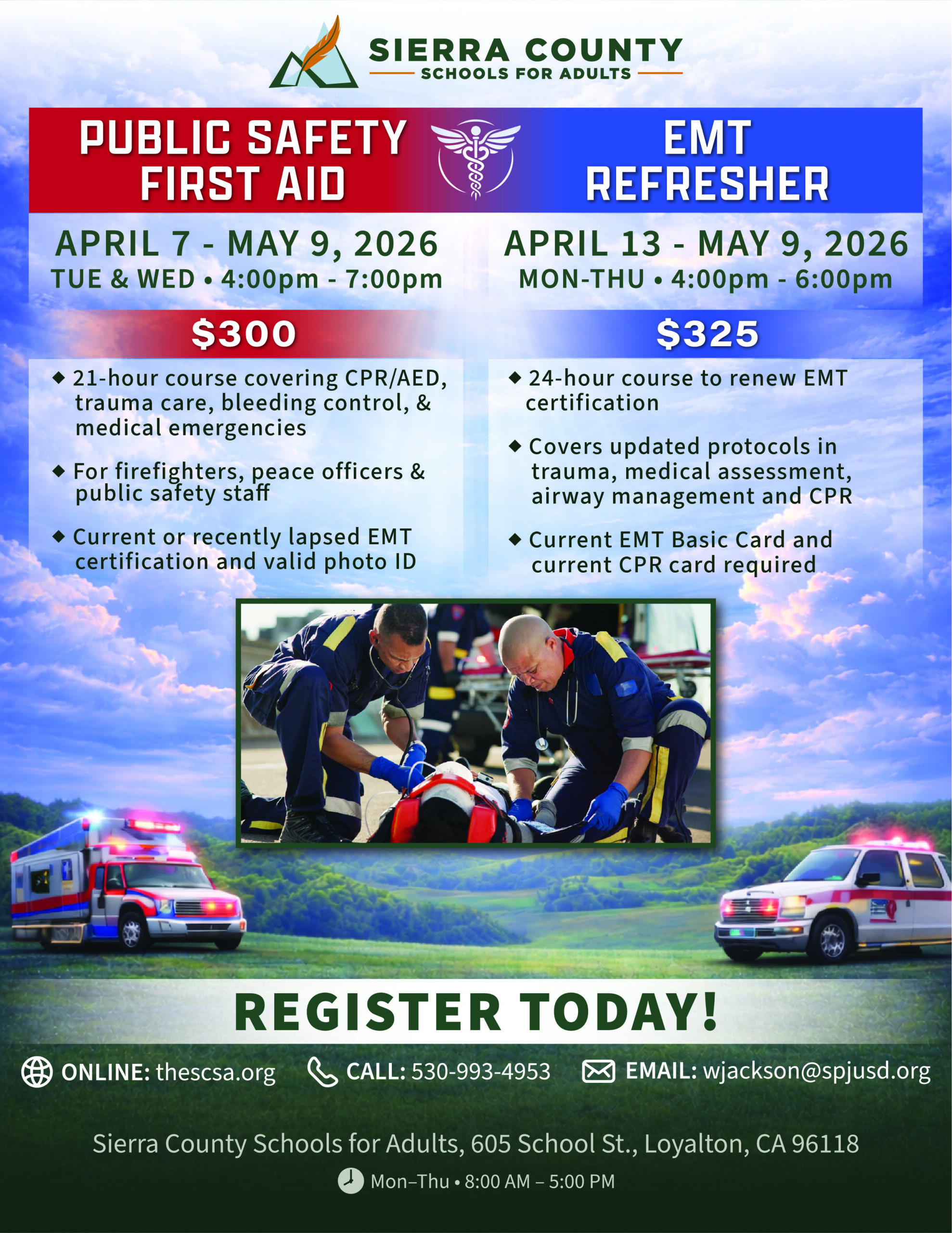 Through our collaboration with the Downieville Fire Protection District and NorCal-EMS, we are proud to offer an advanced EMT training program. Our students learn the skills necessary to be first on the scene of a medical emergency and make life-or-death decisions out in the field.
